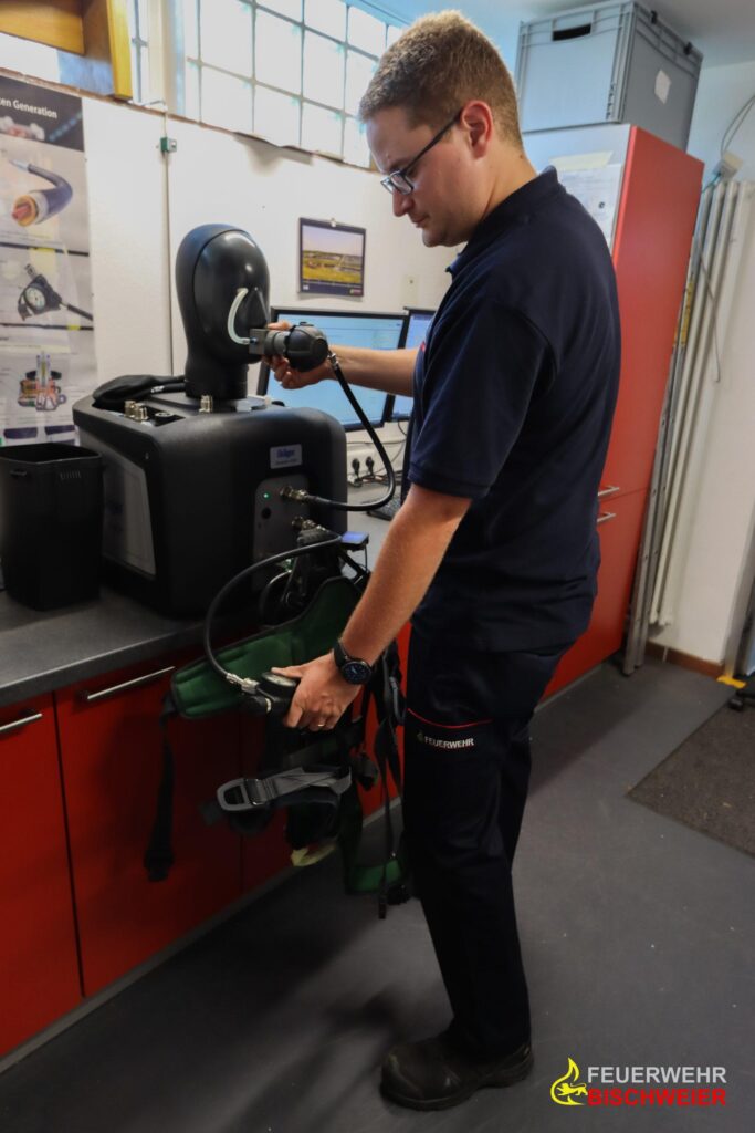 Seit einigen Monaten kann der Atemschutzgerätewart in der Feuerwehr Bischweier in der neu eingerichteten Atemschutzwerkstatt die benutzten Atemluftflaschen wieder für den nächsten Einsatz neu befüllen.