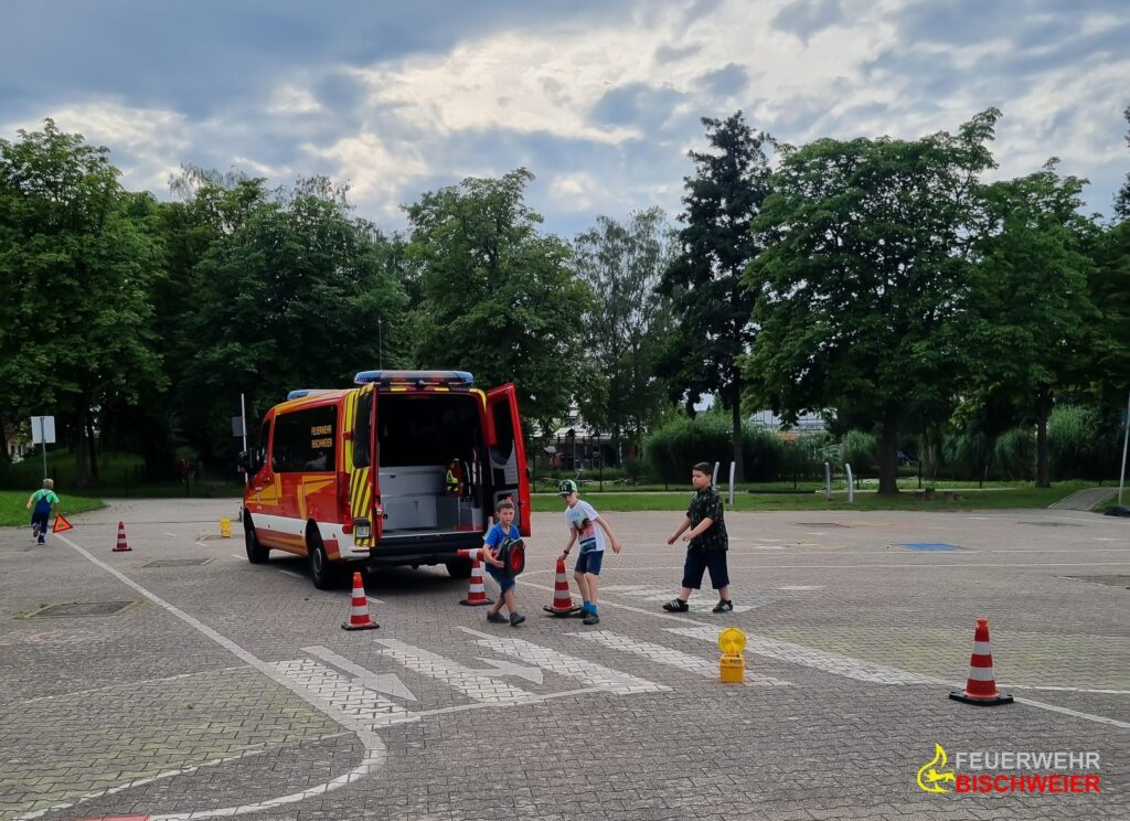 Für die Feuerwehr-Schlümpfe galt es eine Dorfrallye durch Bischweier zu meistern. Vier Gruppen machten sich auf den Weg die höchste Punktzahl zu erreichen. Mit Hilfe der Wegbeschreibung musste der richtige Weg durch das Dorf gefunden werden. Unterwegs sollten die Kinder festgelegte Bilder entdecken und Fragen beantworten. Die Fragen konnten teilweise durch Hinweise auf der Wegstrecke beantworten werden oder mussten durch die Kinder erfragt werden. Am Entensee durften die Fische mit Futter aus dem Automaten gefüttert werden.