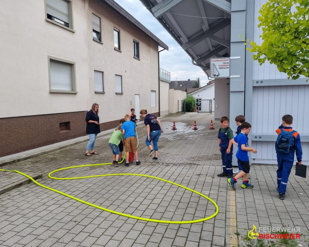 Zusätzlich gab es auf dem festgelegten Weg zwei Stationen, die die Kinder bewältigen mussten. Zunächst wurde auf dem Schulhof der MTW durch die Feuerwehr-Schlümpfe verkehrssicher abgesperrt. Hier konnten die Kinder ihr erlerntes Wissen aus den Lernvideos umsetzen. Bei der zweiten Station, die am Dorfhaus ausgebaut war, müssten die Gruppen Tennisbälle mit einer Kübelspritze von Verkehrsleitkegeln schießen.