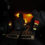 Im Anschluss ging es für den praktischen Teil der Ausbildung auf das weitläufige Übungsgelände. Nach der Zuteilung der persönlichen Schutzausrüstung inklusive zusätzlicher Schutzbekleidung für die Anlage sowie der Atemschutzgeräte mit Masken, konnten die Teilnehmer während der ersten praktischen Übung die verschiedenen Phasen eines Brandes hautnah erfahren. Hierzu wurde durch die Ausbilder in der Übungsanlage ein echtes Feuer endzündet, dies stellt einen wesentlichen Unterschied zu herkömmlichen Trainingsmöglichkeiten dar, zumal diese meist mit Gas betrieben werden. Durch die Verbrennung von Holzpaletten konnte eine realitätsnahe Hitze- und Rauchentwicklung nachgestellt werden. Den Atemschutzgeräteträgern konnte durch diese Übung die Grenzen der Schutzausrüstung sowie verschiedene Phänomene der Brandausbreitung nähergebracht werden. Im zweiten Durchgang wurden die zuvor theoretisch besprochenen Rauchgasdurchzündungen („Backdraft“) im Brandcontainer nachgestellt und die enorme Energie, die hierbei freigesetzt wird, eindrucksvoll demonstriert.