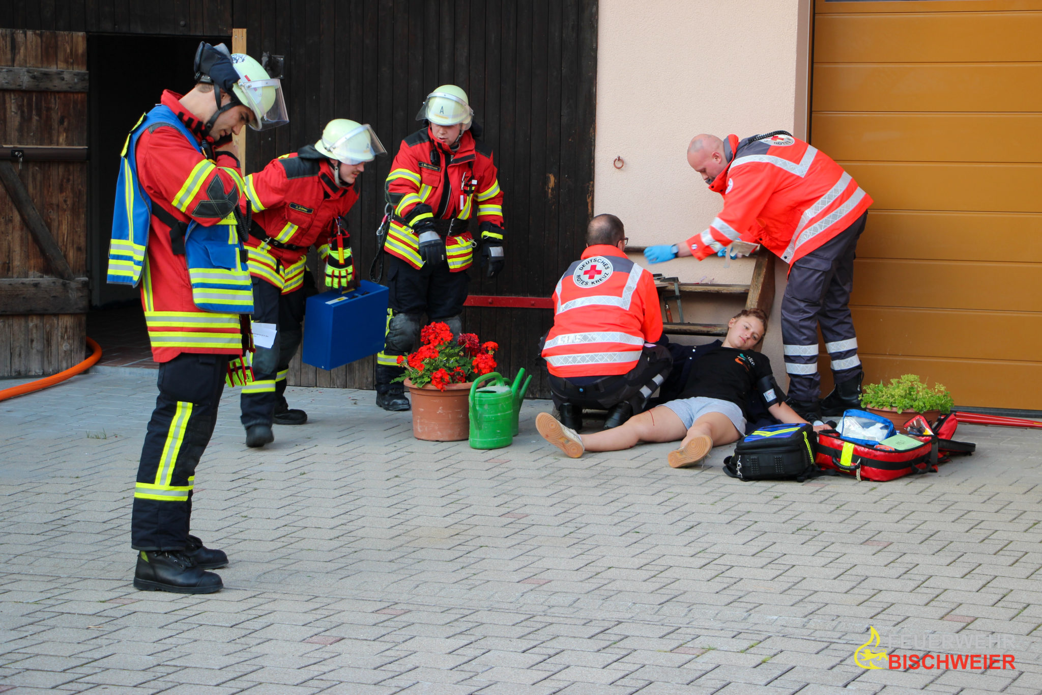 Zu einer Verpuffung in einer Werkstatt in der Bahnhofstraße mit mehreren vermissten Personen wurden die Einsatzkräfte der Feuerwehren Kuppenheim und Bischweier gemeinsam mit den Helfern-vor-Ort (HvO) des DRK Bischweier alarmiert.