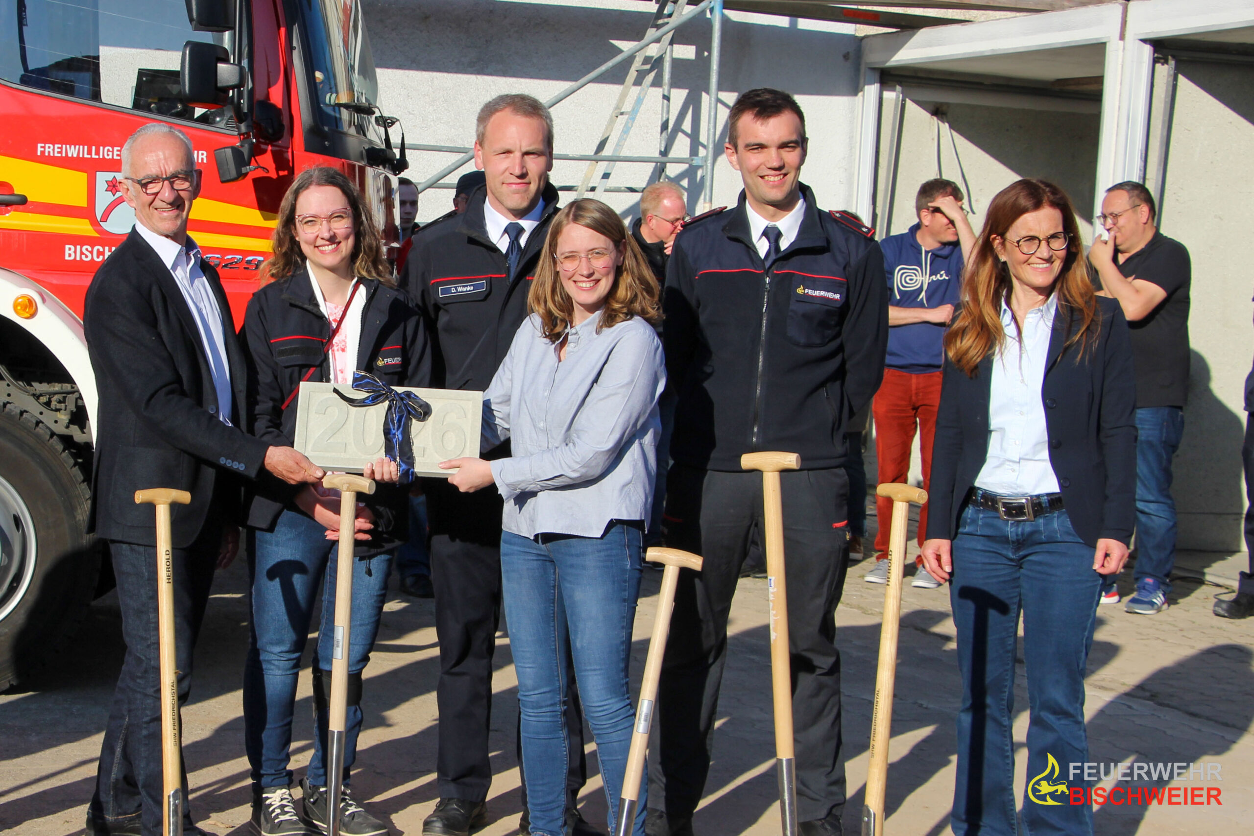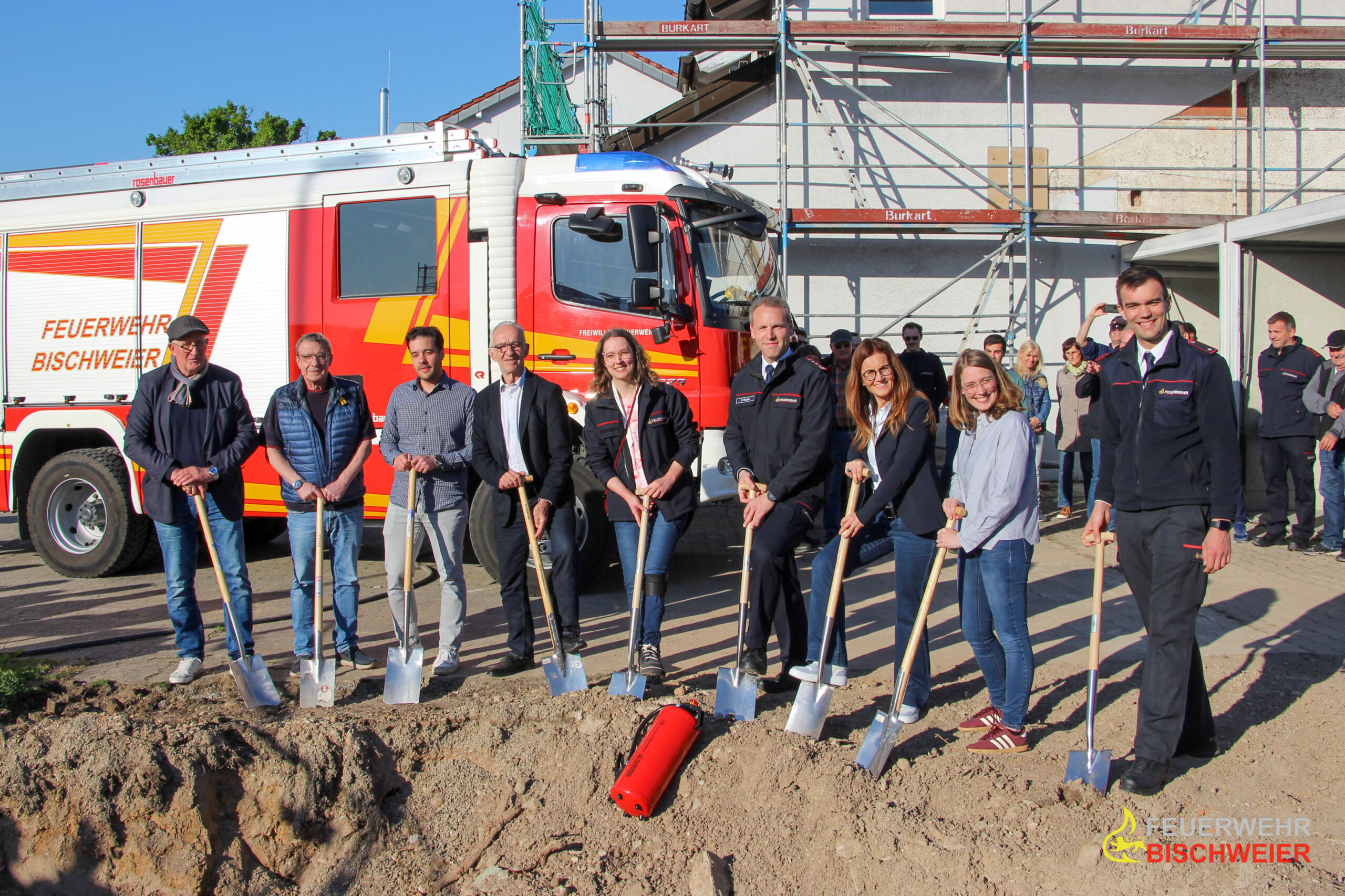 Bürgermeister Robert Wein, dessen Nachfolgerin Fabienne Jox, Vertreterinnen und Vertreter der beteiligten Baufirma sowie des Architekturbüros begaben sich im Anschluss an die Grußworte gemeinsam mit Kommandant Daniel Wanke und dessen zweiten Stellvertreter zum offiziellen Spatenstich.